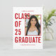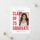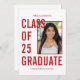 Your graduate's photo, surrounded by large bold lettering "CLASS OF 25 GRADUATE", finished with your name and high school. On the back, you can share a story or the graduate's bio of interests and activities, or delete the text and leave blank. Add your own photo and other details by following the "Personalise" link. The red and white school colours can also be changed, to match your graduate's school colours, by using the edit menu. If you would like assistance, please feel free to reach out to me via email at susanmingaydesigns@gmail.com