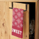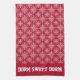 Our custom kitchen towel adorned with red and white pattern and text in school type lettering. View our full line of products in our Zazzle store.