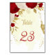 Romantic dark red & white flowers with gold leaves botanical wedding table number card.