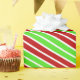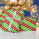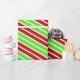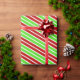 This festive wrapping paper design features various patterns of lines/stripes having Christmas-themed colours like red, white, and green. It might be fun to use wrapping paper like this when preparing presents being given to celebrate Christmas.