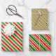 These wrapping paper sheets designs feature Christmas-inspired green, white, and red coloured striped patterns. Festive wrapping paper sheets like these might be used when wrapping presents or gifts being given when celebrating Christmas.