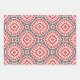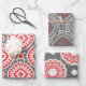 This set of three wrapping paper sheets presents a harmonious blend of traditional aesthetics and modern design. Each sheet is graced with a subtle grey background, upon which bold red geometric shapes come to life. The style of these sheets is reminiscent of traditional textile patterns, offering a sense of familiarity while still maintaining a unique visual interest. Whether you’re wrapping a birthday present or a holiday gift, these sheets are sure to add a touch of sophistication to any occasion.