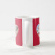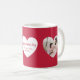 A red coloured background decorated with white hearts, 2 photo heart frames. Personalise and add your name.