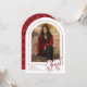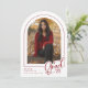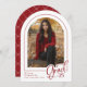 A classic red and white graduation photo announcement but with a modern twist. FRONT: "Grad" is shown in a trendy handwritten script and partially overlays the arch-shaped photo. Personalise the template with your grad's photo, first/last names, school name and last two digits of their graduating year. BACK: An elegant geometric pattern with bows (with the option to delete). © Kimbellished, LLC