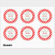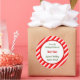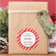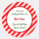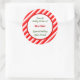 Custom baking stickers with a green script and vintage red letters on a holiday pattern of large red, white and tiny pink stripes.