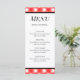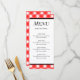 A custom menu card for birthdays, BBQ, celebrations, or restaurants with block letters on a retro red and white plaid checked pattern with wide and thin stripes, you can customise this design to add your own logo, change fonts, even save your design for later.