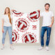 This cute volleyball themed fleece blanket features 5 randomly arranged red and white volleyballs with the text, "The volleyball court is my happy place" in red encircling each volleyball in a fun handwritten style typographic font, all on a white background - the volleyballs' red panels are blended with an artsy, girly floral pattern - her name and jersey number are customisable - by katz_d_zynes