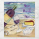 Art shows a bottle of red wine, two wine glasses, and cheese on a sandy beach with seashells. In the background are breaking ocean waves.