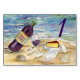A bottle of red wine tilts against a half full wine glass on the beach. A platter of cheese is ready to be cut, as well as, a second wine is ready to be filled. Seashells are intermingled on the sand beach. Soft pastel coloured ocean waves are splashing in the background. Words note "Table 1" but can be personalised with your own words and messages. Create your own unique one-of-a-kind table card design by customising these template red wine beach art table cards for your wedding, reception, or other personal event information.