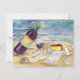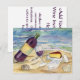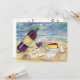 A bottle of red wine tilts against a half full wine glass on the beach. A platter of cheese is ready to be cut, as well as, a second wine is ready to be filled. Seashells are intermingled on the sand beach. Soft pastel coloured ocean waves are splashing in the background. The wine label can be personalised for your own message on a bottle! Painting rendered in watercolor. Add your own text to the back of the red wine beach party invitations. Make customised invites with your own text and images for your party invite!