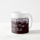 Features a dark red purple wine topped with silvery effervescent bubbles. Says "My coffee cup is half full." Simple but classy, elegant and funny.