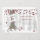 A winter wedding invitation featuring an illustration of a tree in the forest. Tree has red, silver, and white leaves, exposed roots, and a trunk wrapped with banner that can be customised with bride & groom's names. Ground and background trees are white. Wording is from bride and groom.