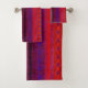 This contemporary, decorative bath towel set features a colourful abstract pattern of an image which resembles woven bands. The brilliant colours of red, purple, blue, orange and black seem to have a neon glow. The image of the woven texture is very realistic but it is actually a machine washable polyester blend.