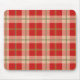 A mousepad featuring a flannel inspired design of red and white plaid with hints of yellow, blue, and green.
