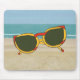 Fun painting of yellow sun glasses with red trim accents, with the sand, ocean, and sky as a background, printed on customisable mouse pads.