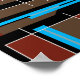 An abstract geometric composition featuring large reddish brown panels combined with deep brown sections, intersected by thin white lines and accented with bright blue horizontal and vertical bars. Curved reddish strokes add motion within the structured layout, creating a balanced contrast between rigid geometry and dynamic elements.