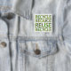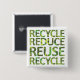 An abstract artwork of many interesting lines and shapes in various shades of green makes up the letters of this message, Reduce Reuse Recycle. Wear this button to express your love for the environment and to spread the message to others.