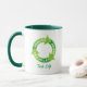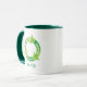 Green enviromental symbol, circle with arrows and the words reduce, reuse, recycle. Custom text on both sides.