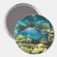Swimming above soft corals, the scales of a blue reef fish pick up a few glints of the sun, as the light filters down from above the water's surface, while other smaller fish swim in the background.