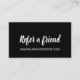 Minimalist, modern, simple, trendy, professional referral card with handwritten font, in black and white.
