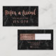 Refer a friend with this modern, stylish makeup referral card with modern hand lettering style brush typography in faux rose gold foil on a trendy and elegant black marble background.