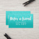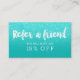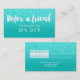 Refer a friend with this modern, stylish makeup referral card with modern hand lettering style brush typography in white on a trendy and elegant faux aqua glitter ombre on plain turquoise aqua.