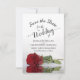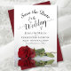 This wedding Save the Date card is romantic, elegant, classy, and beautiful. It features a photograph of a single long stemmed red rose reflecting in a pool of water with waves and ripples. The text is a fancy script calligraphy on a white background. The back features a deep red or burgundy plush pattern. Perfect way to let your friends and family know about your upcoming wedding.