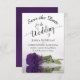 This wedding Save the Date card is romantic, elegant, classy, and beautiful. It features a photograph of a single long stemmed purple rose reflecting in a pool of water with waves and ripples. The text is a fancy script calligraphy on a white background. The back features a deep marbled purple pattern. Perfect way to let your friends and family know about your upcoming wedding.
