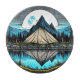 Ai art depicting a camping tent reflecting in the water of a lake with a pine tree and mountain background with the full moon shining down. Genereativecontent with a vintage vibe. Blue and tan colours.