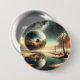 This weathered, surreal metallic sphere reflects an apocalyptic, baron desert landscape, with dead trees, fire and smoke.