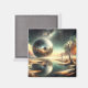 This weathered, surreal metallic sphere reflects an apocalyptic, baron desert landscape, with dead trees, fire and smoke.