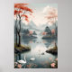 A serene landscape of gentle mountains and a tranquil lake, adorned with cherry trees with vibrant red blossoms. White swans glide across the water, creating a scene of peace and natural beauty. An invitation to contemplation and relaxation.