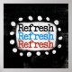 A cute typographic design that says "Refresh Refresh Refresh". It's black, red and blue text on a white rectangle with funky, playful white dots surrounding it, all on a black background.
