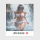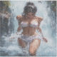 A vibrant artwork depicting a young woman standing beneath a refreshing waterfall, with sprays swirling around her in a lively summer scene that blends the beauty of nature with a spirit of adventure.