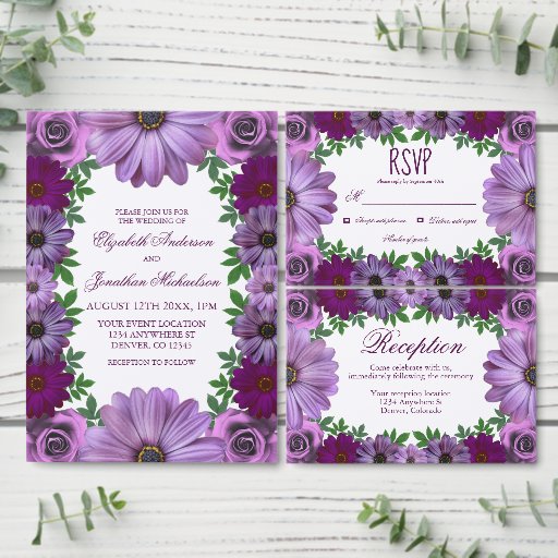 Regal purple floral design features roses and flowers in various shades of purple
