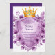 This exquisite wedding invitation template features a royal golden crown adorned with amethyst jewels, nestled above a heraldic shield framed in gold. Surrounding the design are lush lavender and violet peonies, creating a luxurious, vintage floral motif. Perfect for romantic, royal-themed weddings or elegant celebrations with a touch of nobility and floral charm. The blank shield provides space for custom names, dates, or messages.