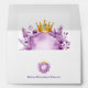 This exquisite wedding invitation template features a royal golden crown adorned with amethyst jewels, nestled above a heraldic shield framed in gold. Surrounding the design are lush lavender and violet peonies, creating a luxurious, vintage floral motif. Perfect for romantic, royal-themed weddings or elegant celebrations with a touch of nobility and floral charm. The blank shield provides space for custom names, dates, or messages.
