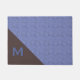 Stylish regency blue door mat, with a metal looking decorative circle pattern. The bottom left corner is done in solid brown, with a regency blue single letter monogram ready to personalise.