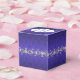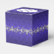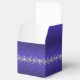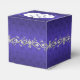 Elegant wedding favour box done in a regency blue damask background. The top of the box has a decorative silvery grey and white text plaque, with regency blue custom text ready to personalise. Lovely digital graphics of a silver tone floral jewel like garland, runs around the middle of the box. Lovely little gift box for candies and anything else you want to give your guests.