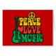 Type design of PEACE, LOVE & MUSIC with guitar, peace symbol, heart and musical notes in yellow, red and green.