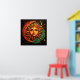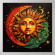 A sun face surrounded by the moon and stars in space with red, gold, green reggae colours
