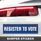 Bumper sticker featuring the text "register to vote" in white on a dark blue background with thin, red borders above and below.