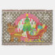 Pretty Reindeer and Sleigh Christmas holiday throw blanket with a background of white polka dots on brown, a circle of dots on pink, a centre of white with various colours polka dotted trees, white snowflakes, Santa's sleigh full of gifts and candy canes, a decorated tree with yellow star on top, and a reindeer! You can easily personalise by adding your family name to the sleigh!