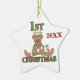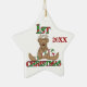 An adorable baby's 1st Christmas ornament featuring a teddy bear with reindeer antlers and a candy cane and candy cane striped text that reads "1st Christmas". It's dated 2010 but you can easily change the date!