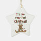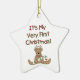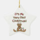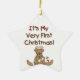 An adorable baby's First Christmas ornament featuring a teddy bear with reindeer antlers and a candy cane and candy cane striped text that reads "It's My Very First Christmas".
