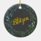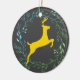 Yellow Blitzen the reindeer in the night sky surrounded by a wreath of blue and green.