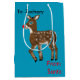 Festive From Santa Personalised Name. Festive cartoon character Super Snow the Blue-Eyed Reindeer button buck with his red nose with bits of blue, and white spots on his furry brown coat. He's Santa's youngest button buck hoping to join his sleigh one day! Original Artwork Design © 2016 TamiraZDesigns.