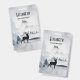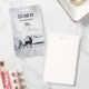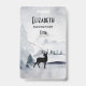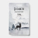 Personalised name tag with a watercolor image featuring a black silhouette reindeer standing among some pine trees. Grey black and white neutral colour scheme.