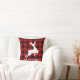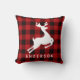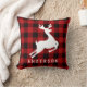 Square holiday accent pillow features a monogram of your last name (or other text) with a red and black check plaid buffalo patterned frame and white reindeer silhouette.