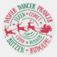 Festive holiday design features Santa and sleigh in centre with names of all the reindeer in circle pattern on light grey background.